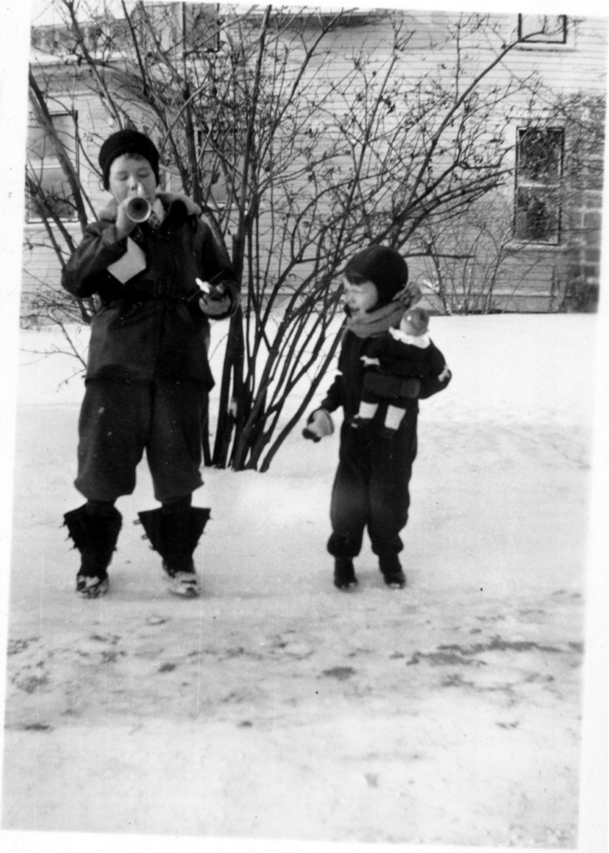 Mrs. T.O. Hannaher writes “Winter 1931 / Bill 0 / T.P. 6” but does not identify herself or the driveway (west) side of 609 Fourth Avenue South. Bill could be at most 6 months old if it was still his birth year. T.P. is wearing leggings under short pants. The stamp of The Oyloe Studio of Moorhead, Minnesota promises any size film developed and printed for 25¢. Gerhardt E. Oyloe had bought a studio on Center Avenue in 1930.