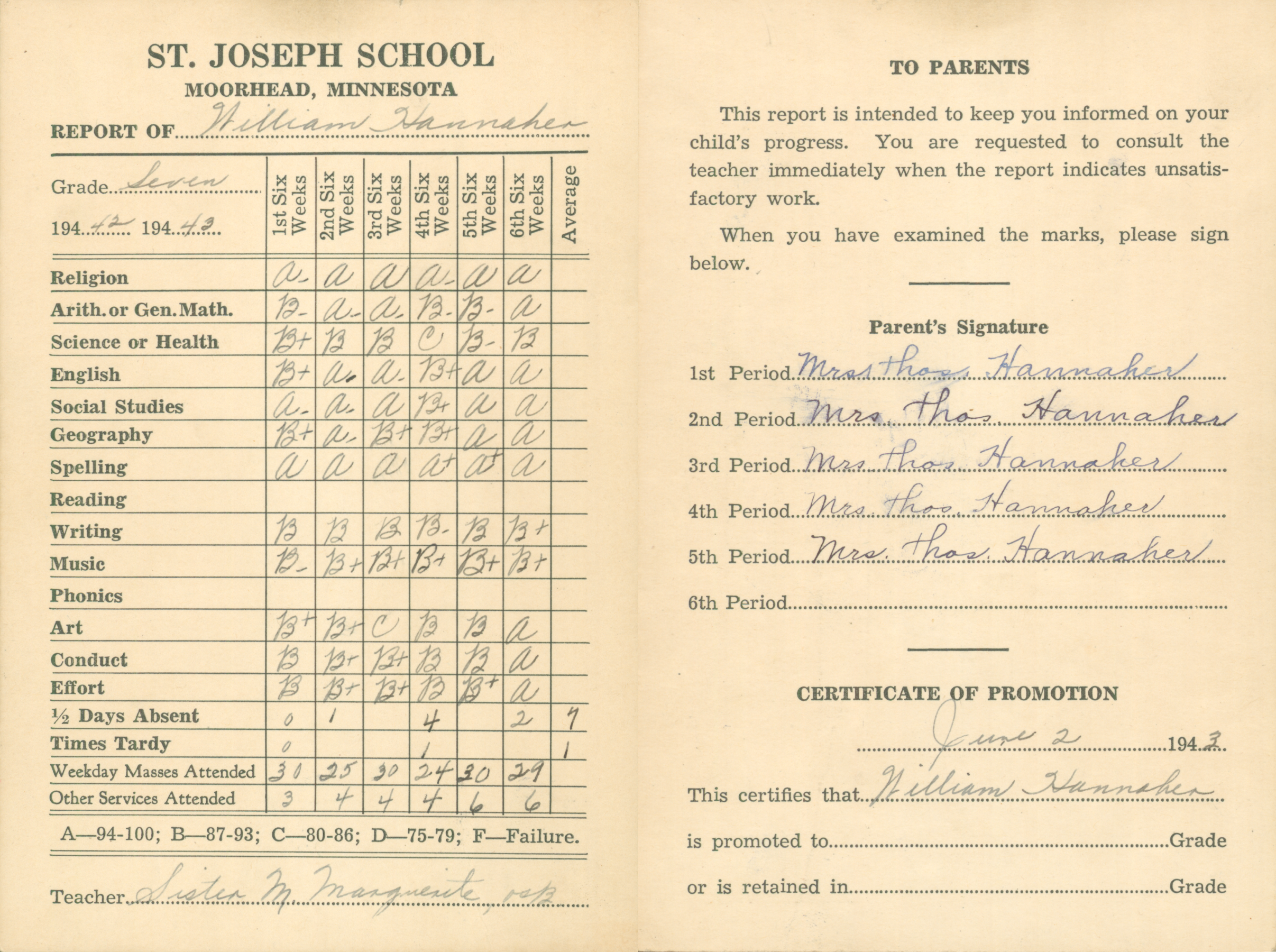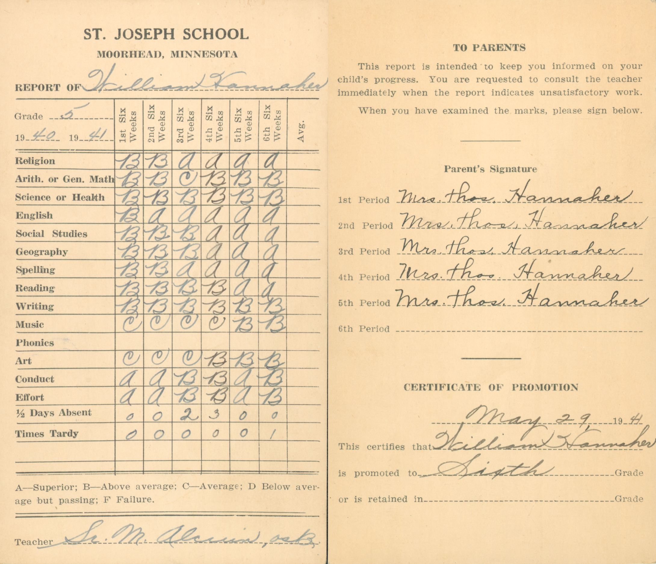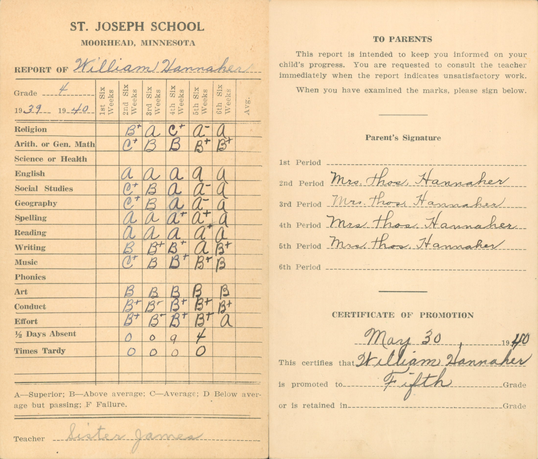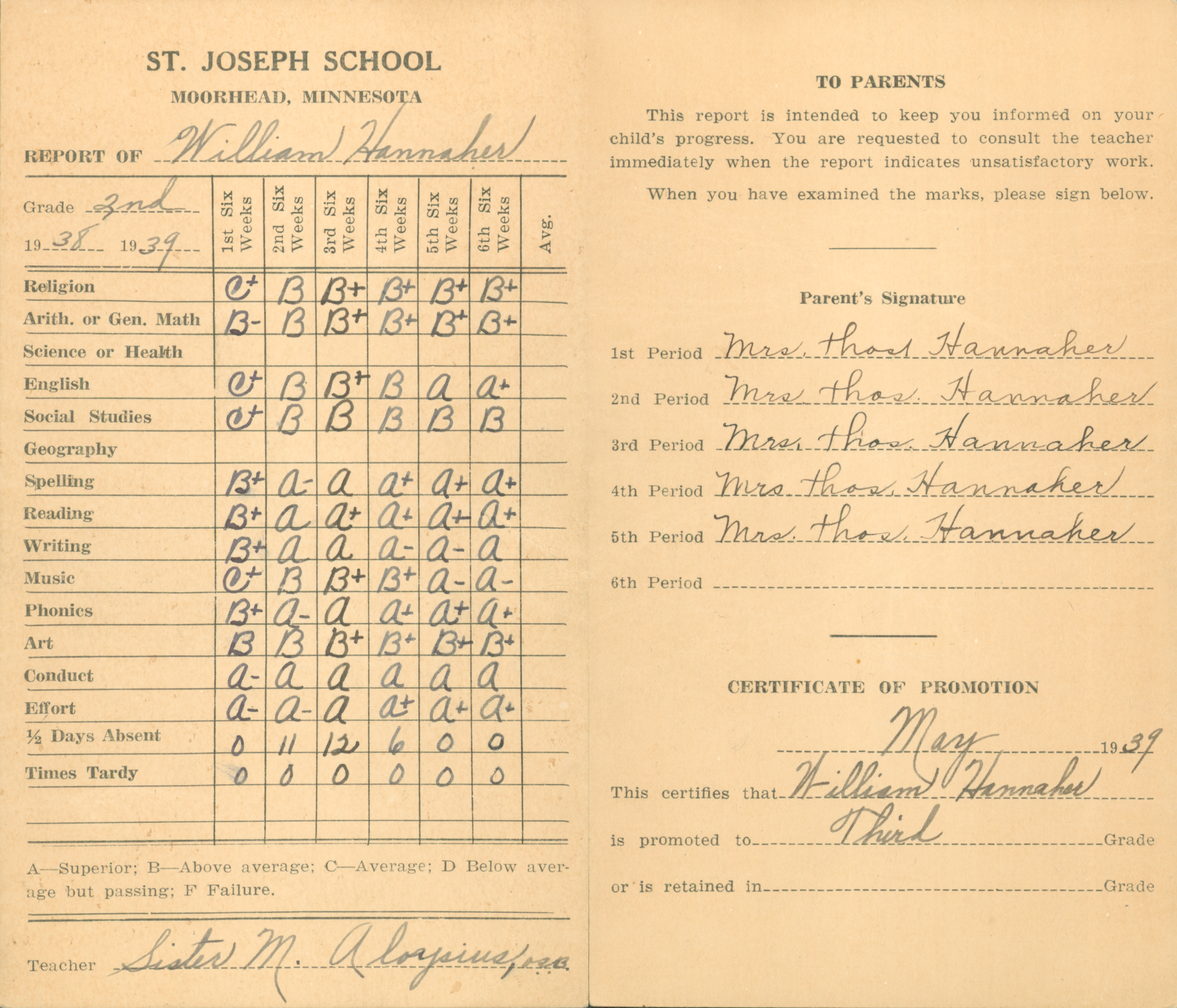 William Hannaher started the third grade at the St. Joseph School of Moorhead, Minnesota with poorer grades, the blank columns are because Billy was promoted to the fourth grade.