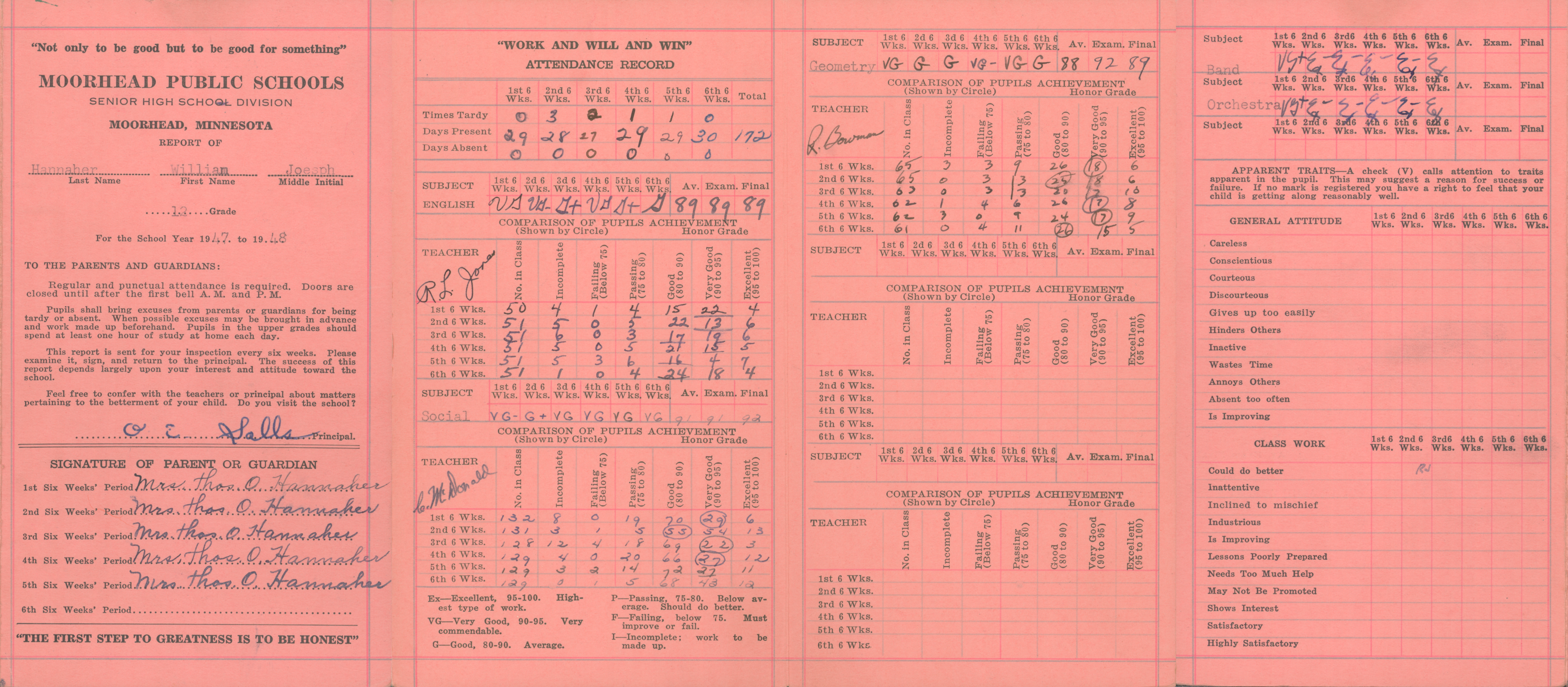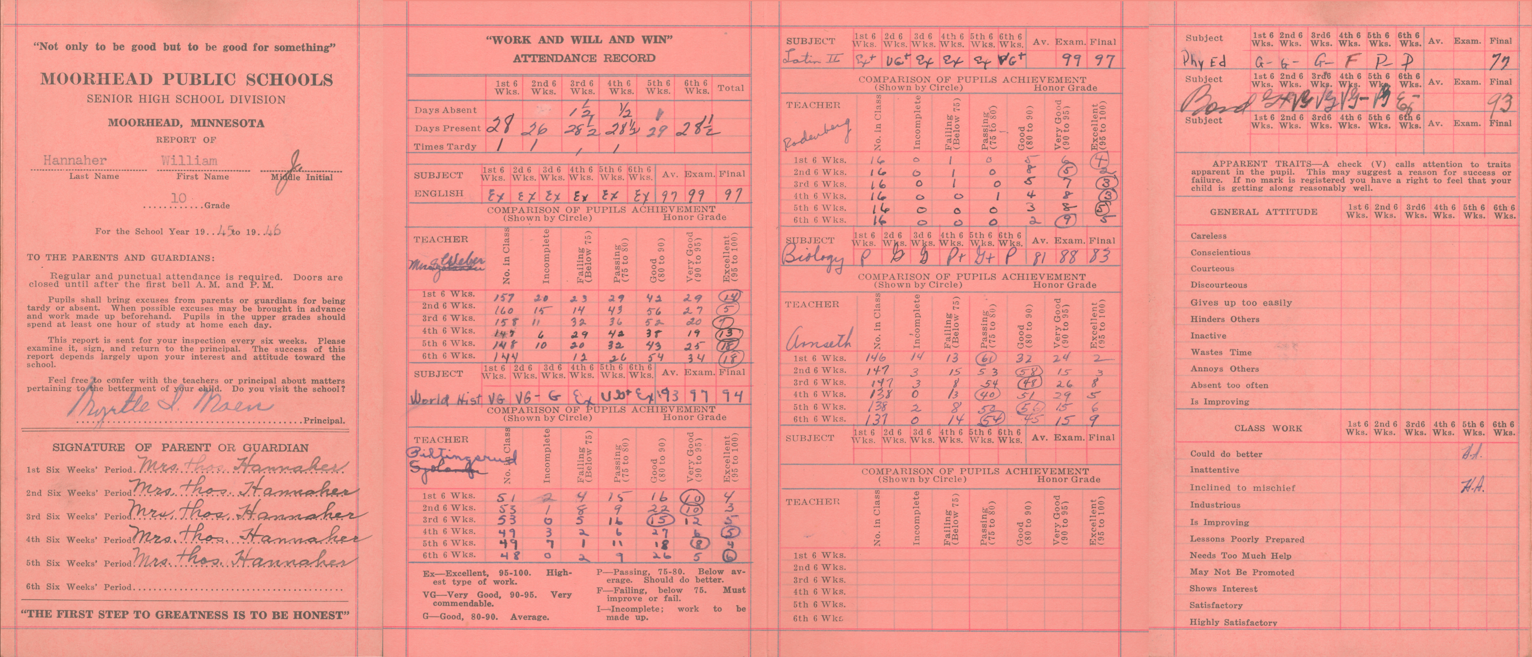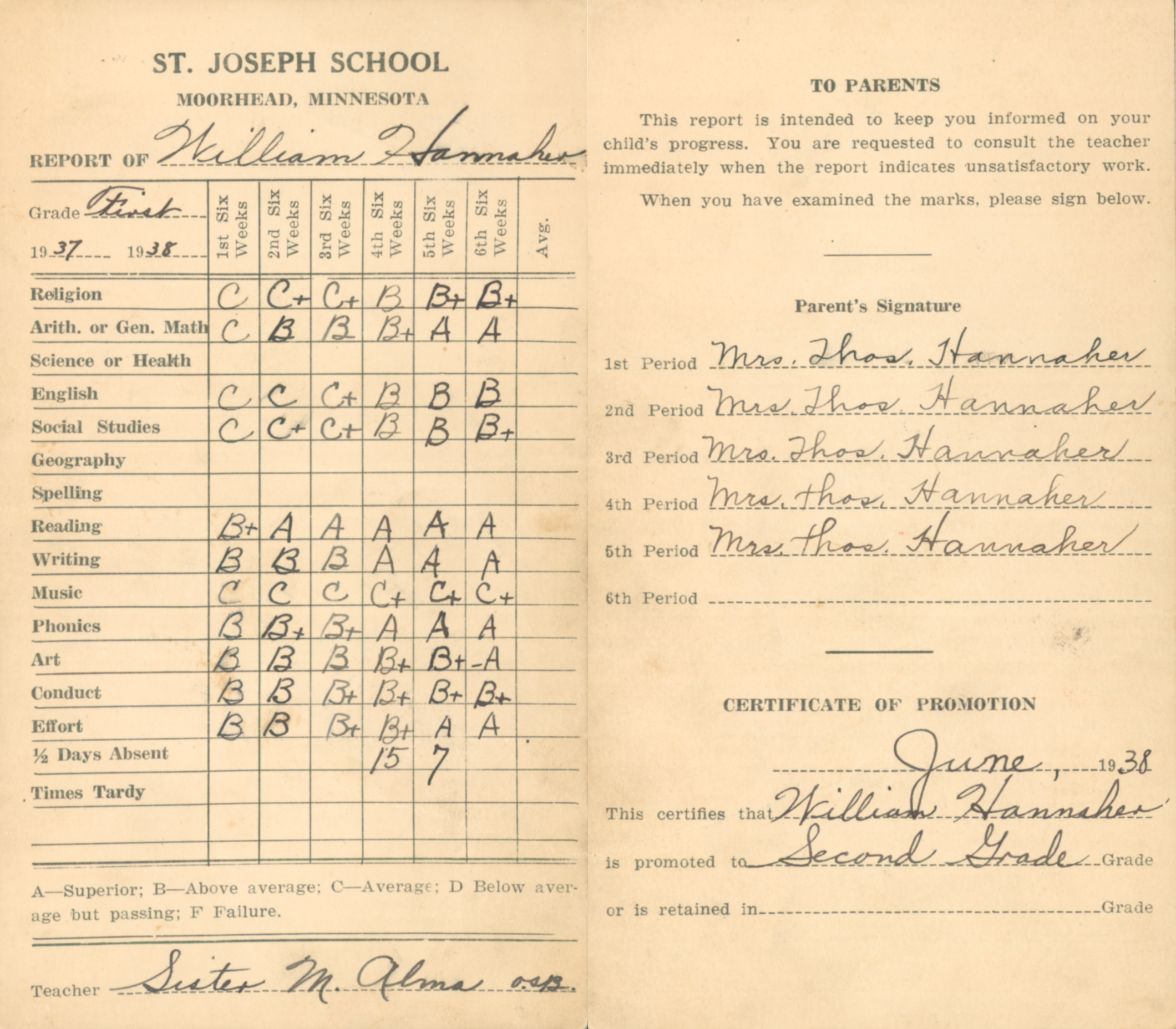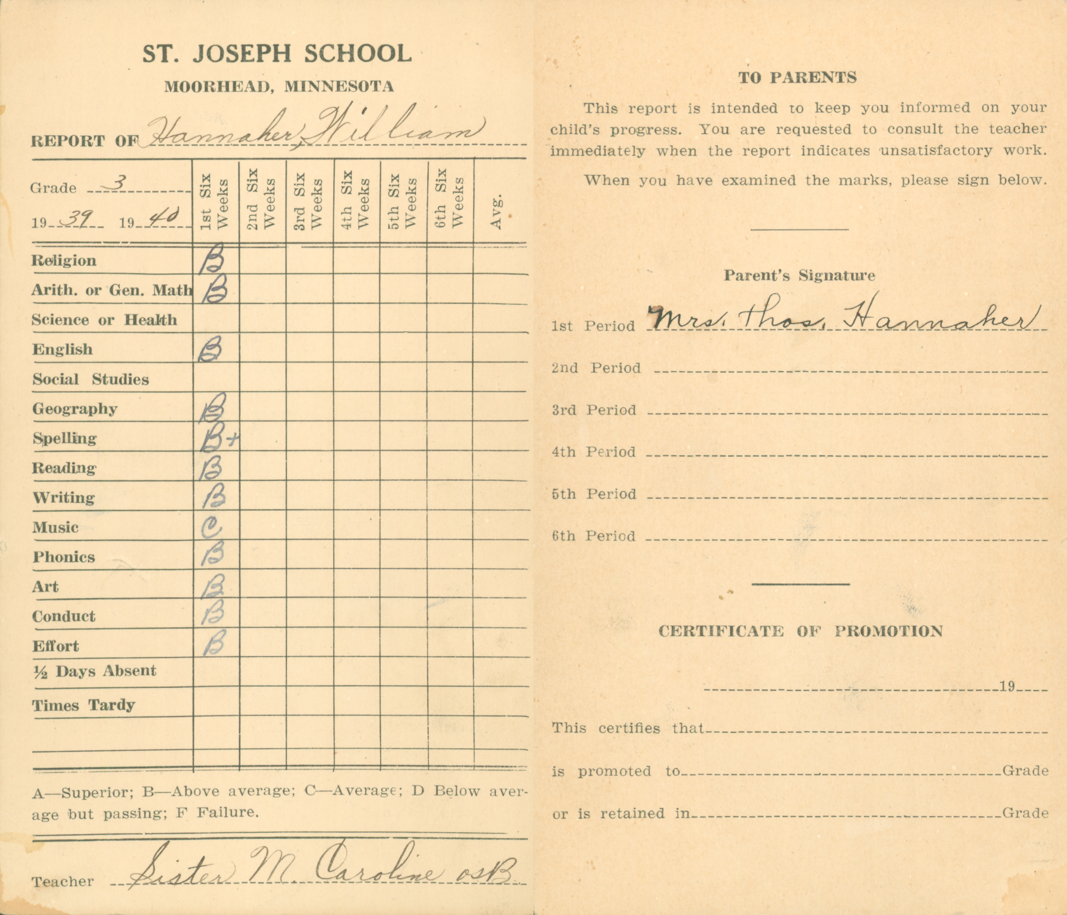 William Hannaher started the third grade at the St. Joseph School of Moorhead, Minnesota with poorer grades, the blank columns are because Billy was promoted to the fourth grade.