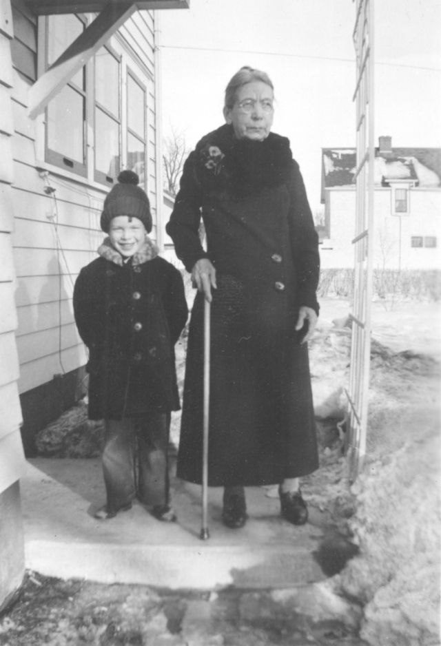 An adult Liam writes “with Grandma Hill, ca. 1938.” The distinctive mid-ridge chimney of 407 Seventh Street South is to the east of the backyard, built 1934.