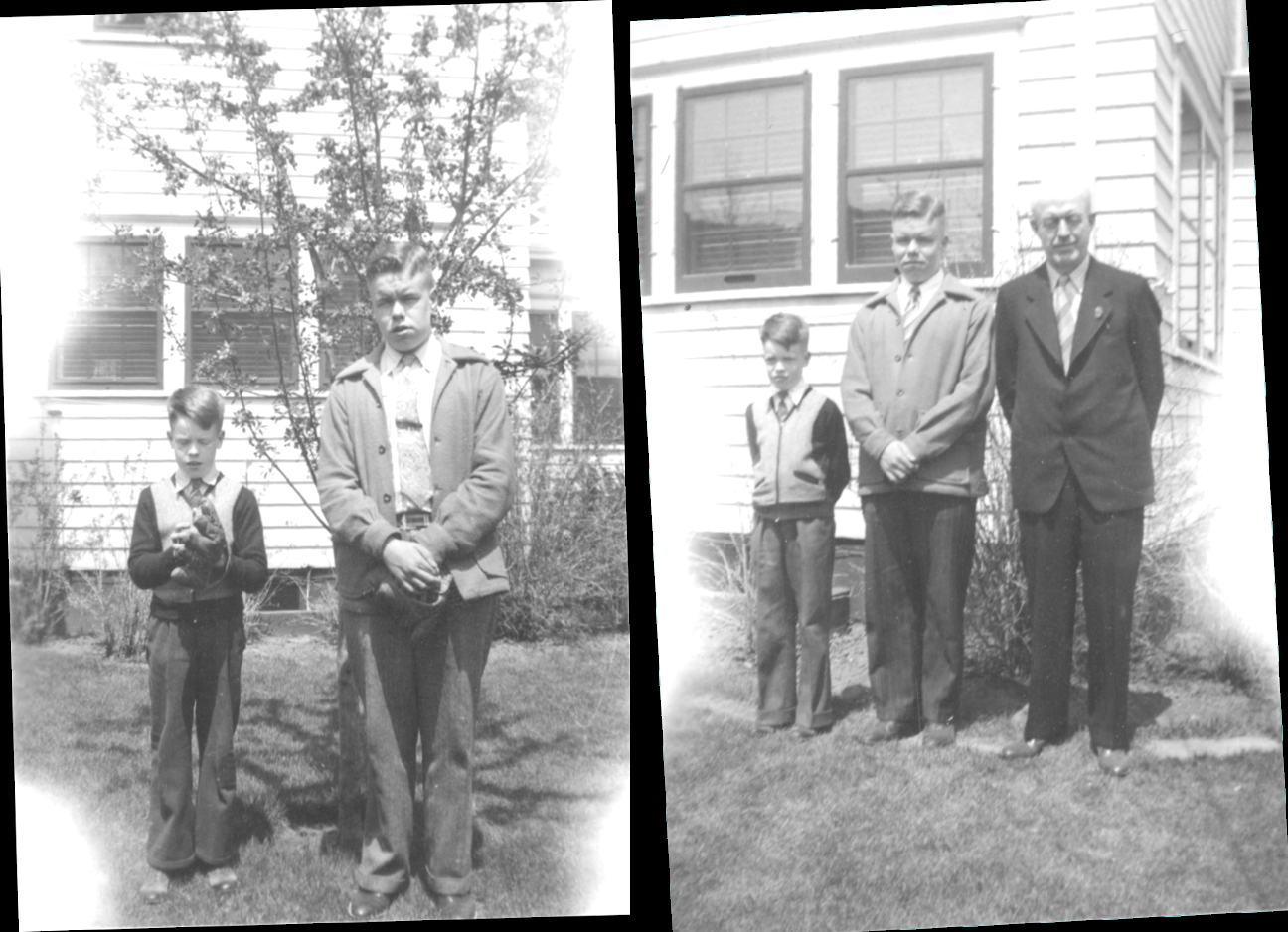 These are adjacent in the photo album but 8 weeks separate the captures: on the left, the only notation is “Easter 1940” which was March 24th that year, the younger brother is wearing a baseball mitt; on the right, the identification is “May 19 — 1940/Wm. J. Hannaher 9/Thos. P. (ditto) 15/Thos. O. (ditto) 58” and the different day can be confirmed by the older brother’s different tie.