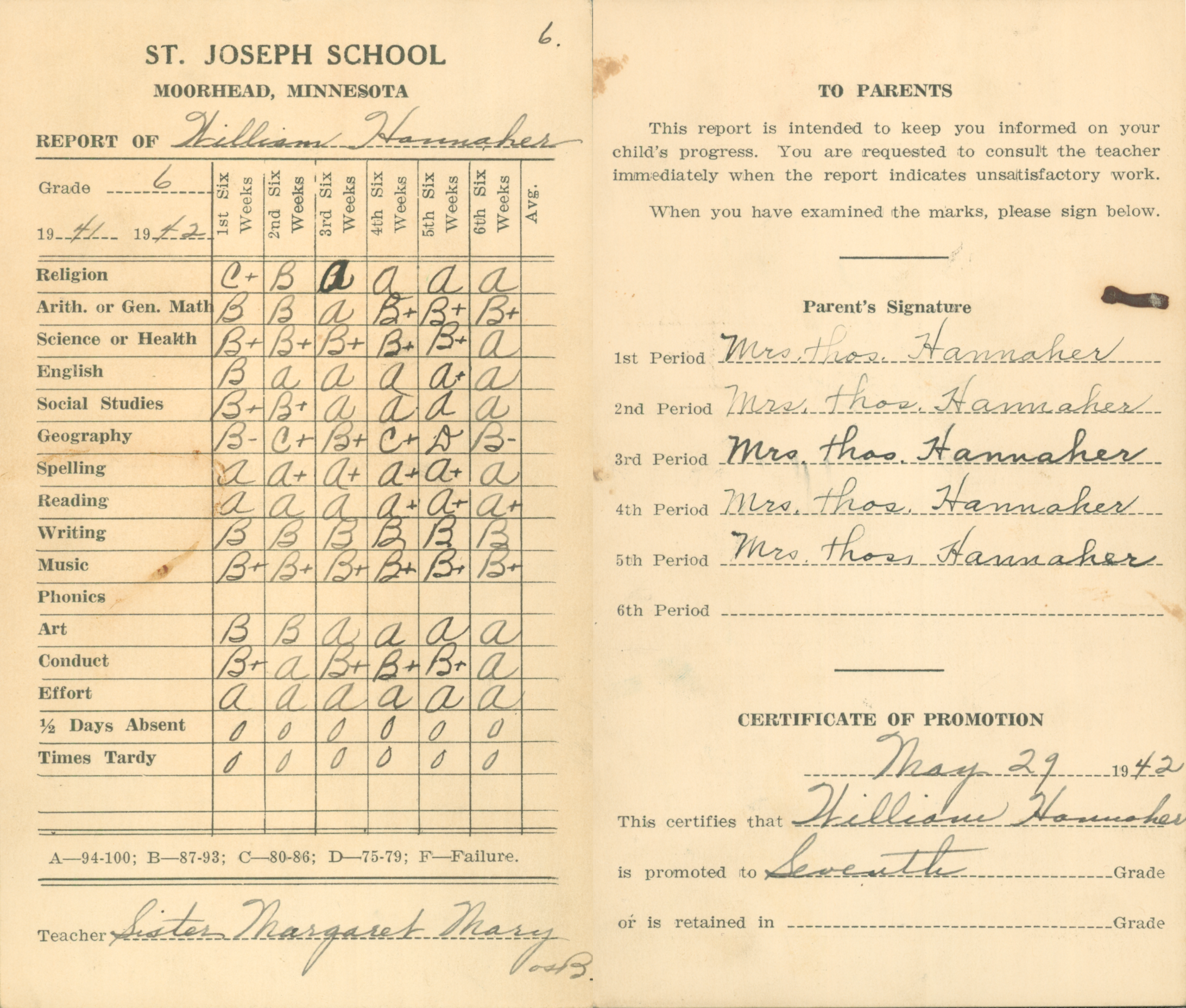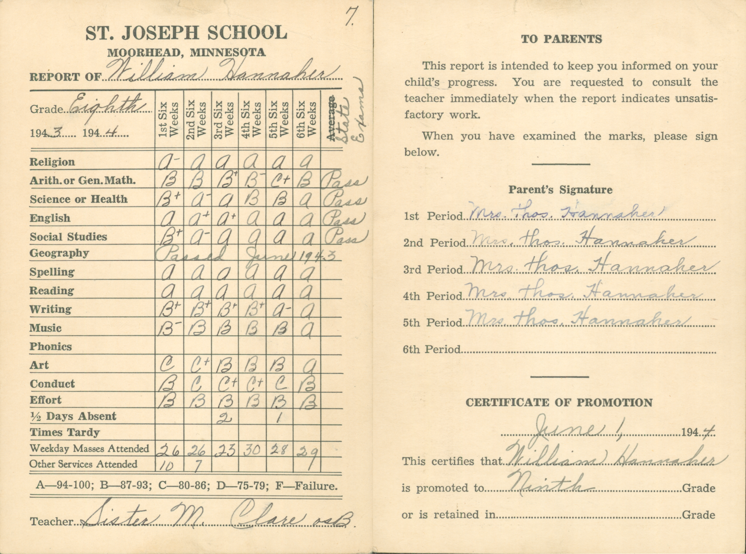 Time for a parent to consult the teacher about William Hannaher’s unsatisfactory work in Geography, his first “D”! The sixth grade at the St. Joseph School of Moorhead, Minnesota ends better, the promotion to seventh grade is decided as war in Europe continues.