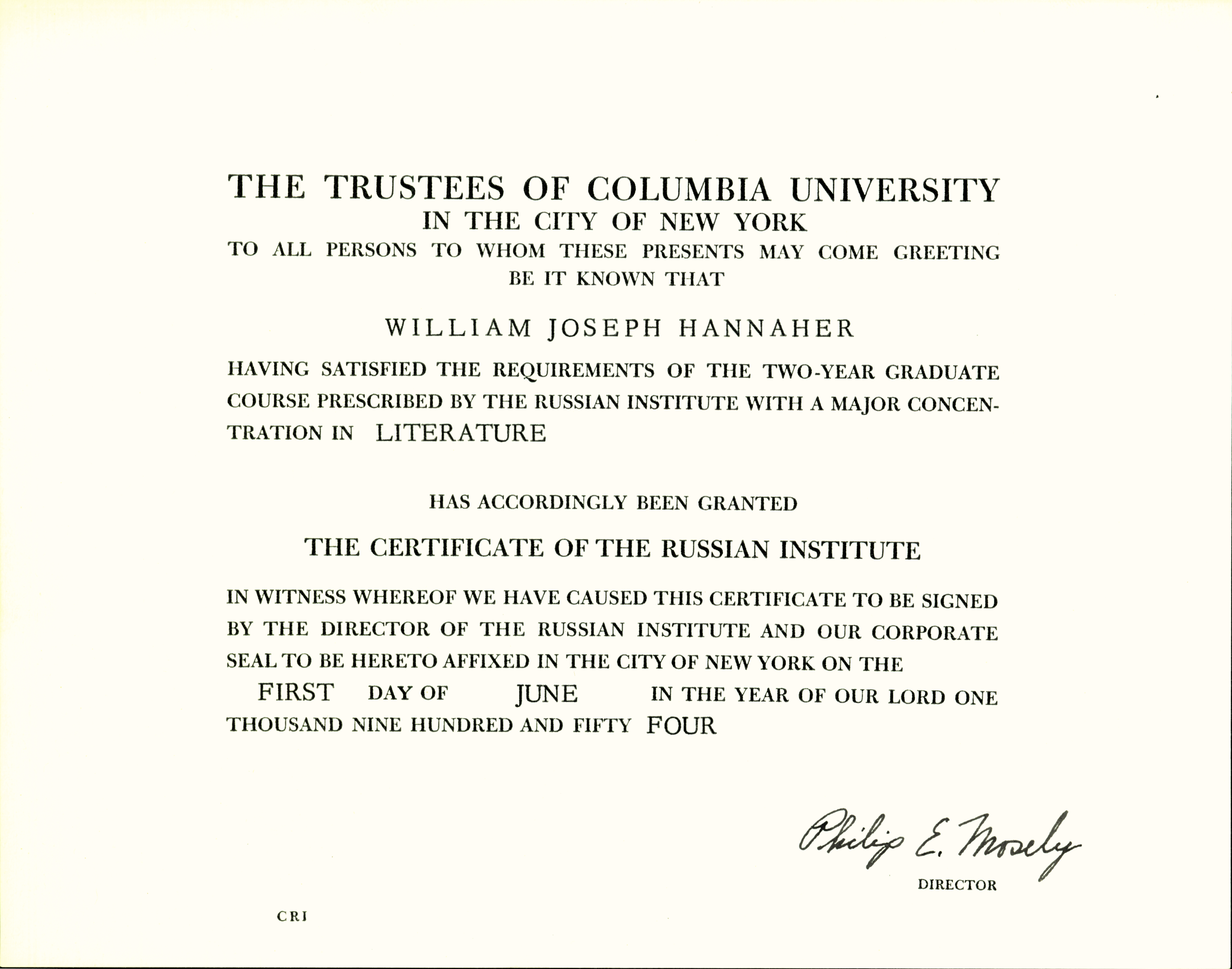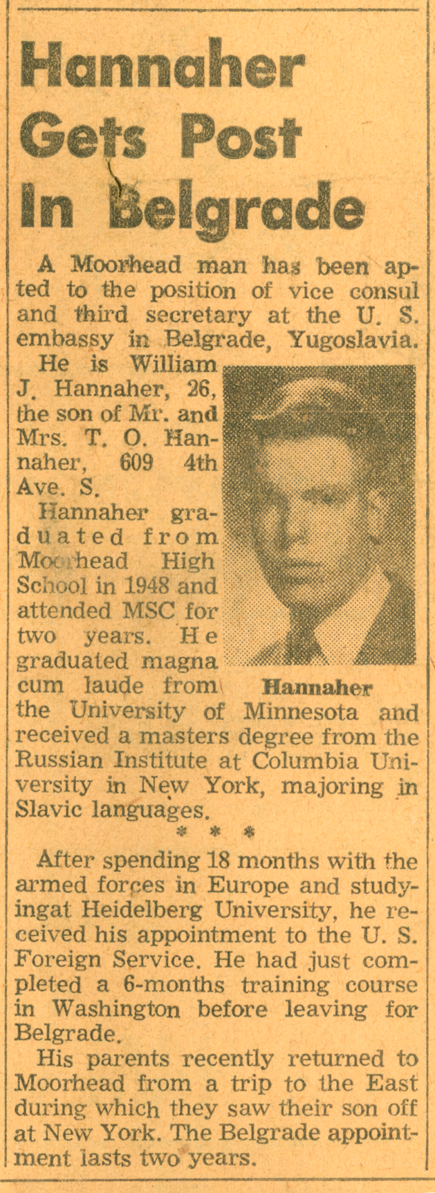 The Moorhead High School Class of 1948 starts its 60th Reunion. Liam Hannaher’s contribution is “I retired as a translator with a fragment of the Central Intelligence Agency. Svetlana taught her language at the Department of State. Both sons are federal employees., Since 1992, I have done volunteer work at the Corcoran Gallery of Art in Washington.” [source: booklet]