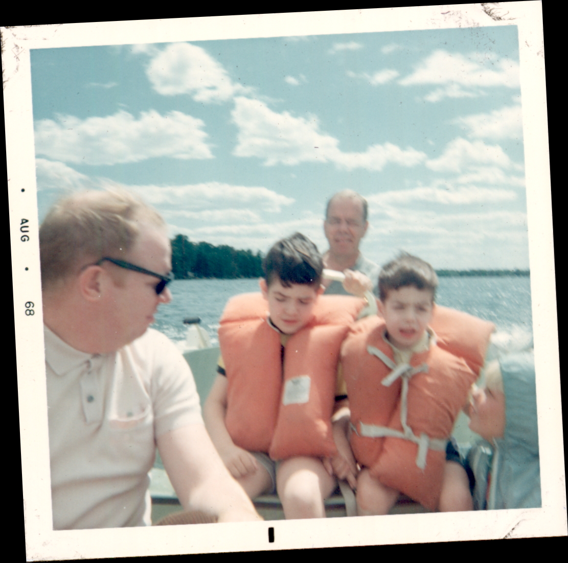 Wm J. Hannaher (6) stands in the grass by a cottage on Lake Pelican, July of 1937.