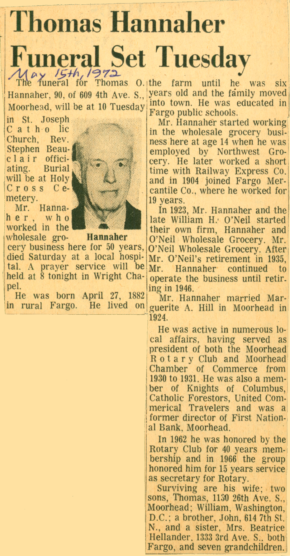 President of Hannaher & O’Neil Wholesale Grocery in Moorhead, Minnesota, Thomas had started the firm with William H. O’Neil in 1923 by taking over Pederson Mercantile Co. and married a Fargo girl the subsequent year. They told different newspapers different stories regarding when and where they got married, presumably because by the weekend of September 22-23, 1924, their first child was already on the way. Thomas Patrick Hannaher was born April 23, 1925, so by the time of William’s birth, he was 6, and his father was 49, and his mother was 43. The house at 609 Fourth Avenue South had been built in 1928, the second on the south side of the avenue in that block, and occupied by Christmas. [sources: obituaries, City of Moorhead Property Information, The Fargo Forum and Daily Tribune]